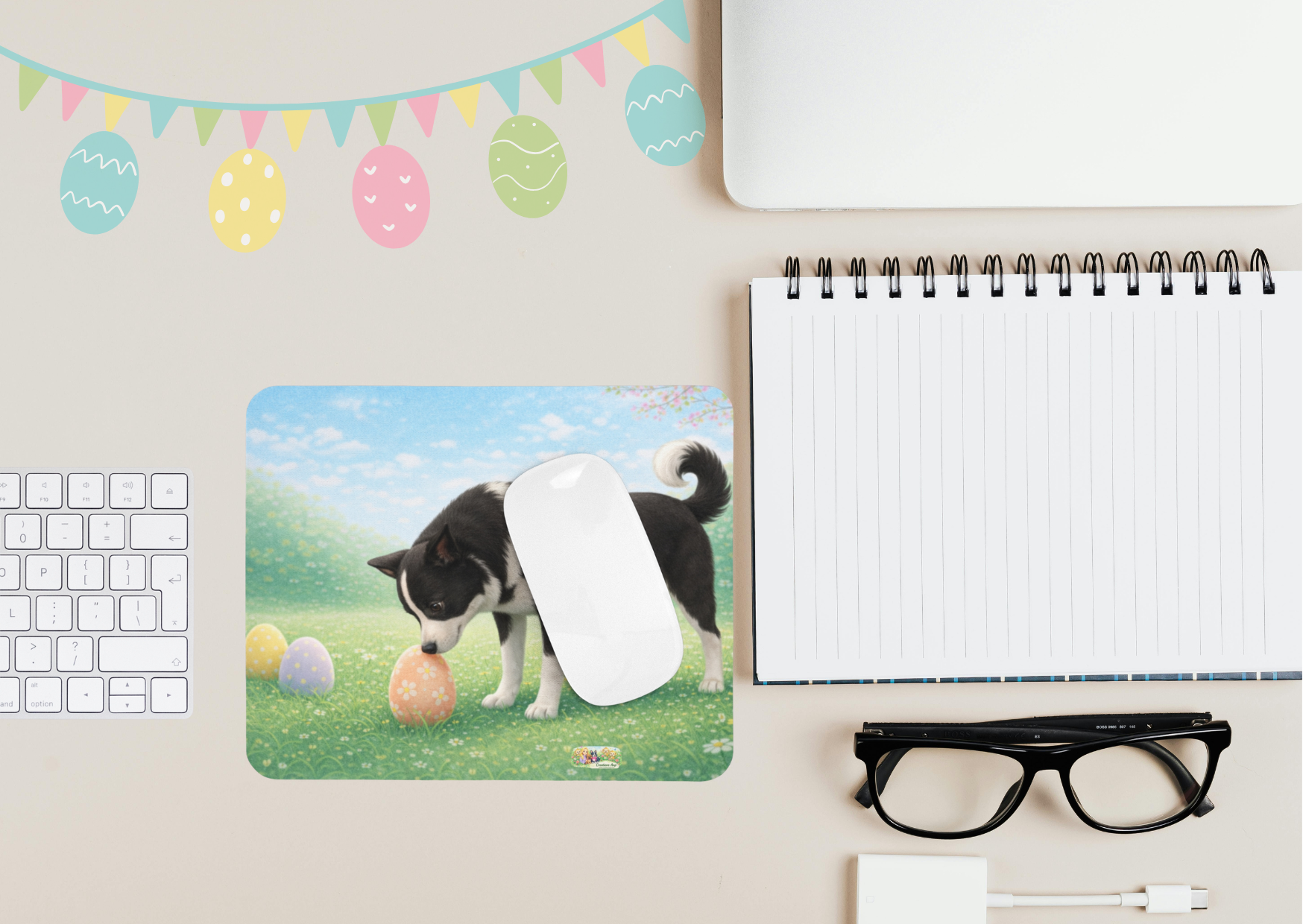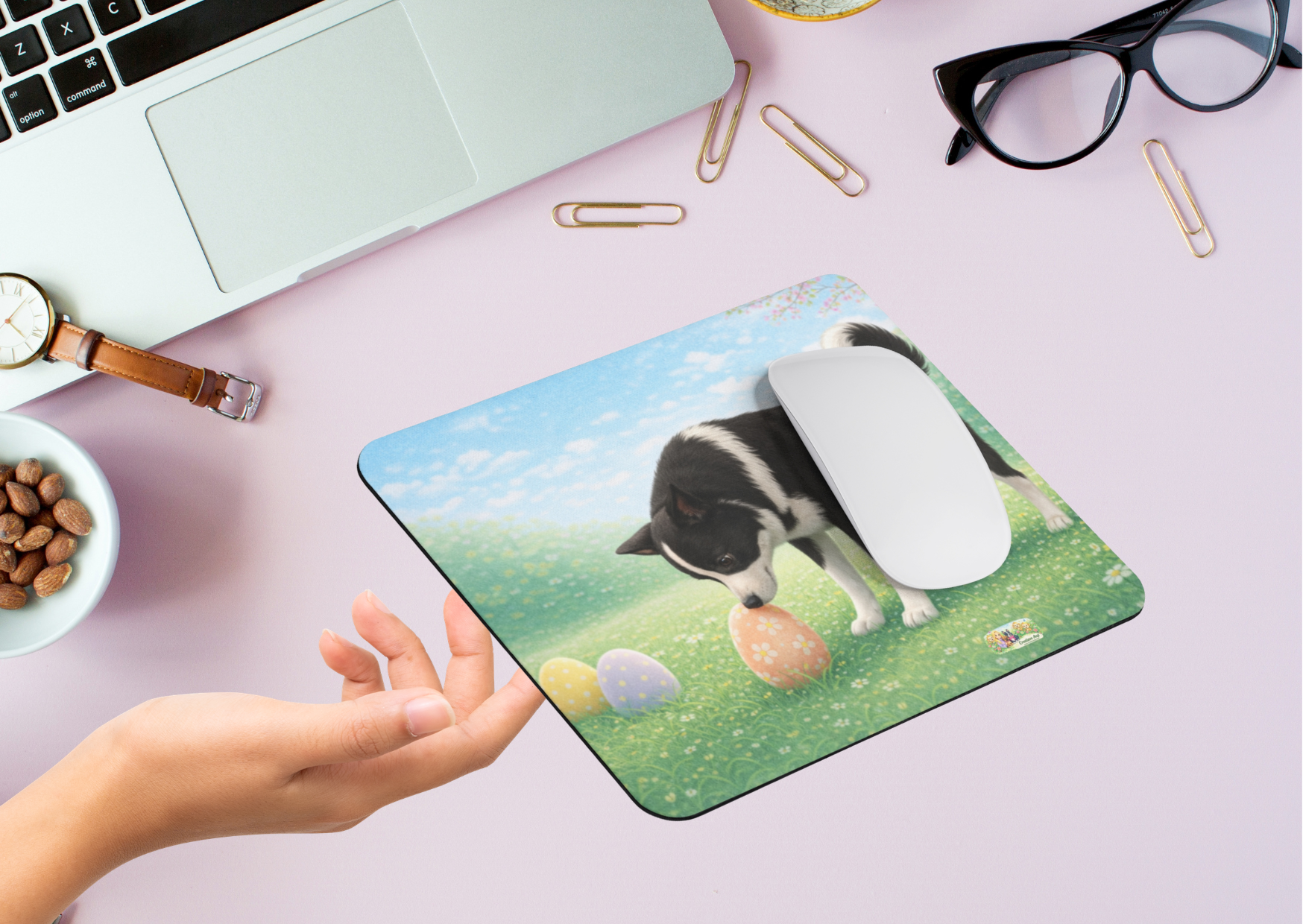 Deze Nikita Paas Muismat toont Nikita in een zacht lentelandschap vol bloemetjes en pastel paaseieren. Een warme, rustige uitstraling die perfect past bij een stijlvolle thuiswerkplek of creatieve studio.